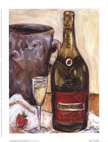 Title: Champagne And Strawberries. Artist: Nicole Etienne. Image Size: 5.01in. x 7.02in. Paper Size: 6.00in. x 8.00in. MUSEUM WRAP CANVAS Print With Added Heavy BRUSHSTROKES