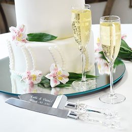 Feel the warm breeze of the tropics blow across your face with our Beach Champagne Flutes & Cake Server Set. Set includes two toasting flutes, a cake cutter and a cake server. Each piece features shimmering starfish, embellished with diamond dust and Swarovski crystals, arranged by hand to create a sparkling sensation. Flutes are made of hand-blown glass, which may contain tiny air bubbles. Available in White (W) and Ivory (I).As an added value, flutes and cake server are personalized with your first names and wedding date for free. Items may be sold separately, but save 10% when your purchase as a set. Details:Size: Flutes measure 8 1/2 inches tall. Cake server measures 11 inches long. Cake knife measures 13 inches long.Materials: Starfish, brushed silver, acrylic, hand blown glass and diamond dustEngraving Options:The Beach Champagne Flutes & Cake Server Set may be engraved on the two flutes and cake server with two first names and wedding date (max of 24 characters per line) or two script custom lines (max of 24 characters per line) at No Additional Cost. Read more...