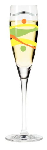 Designer Adrian Olabuenaga's 2004 Pearls Prosecco Wine Glass, Green & Yellow Swirls - Designer Made, Colour Enameled Champagne Flute Glass in Gift Box. These beautiful German Designer Champagne Glasses or Flutes feature colour enameled images from over 34 different Ritzenhoff Designers. These quality champagne glass flutes are 220 mm high with a 64 mm bowl diameter which tapers to a long, slendorous stem to the foot, where it then flows outwards to provide the classic saucer shape bottom. The champagne flute is a stem glass with a tall, narrow bowl. As with other stemware, the stem allows the drinker to hold the glass without affecting the temperature of the drink. The bowl is designed to retain champagne's signature carbonation, by reducing the surface area at the opening of the bowl. These magnificent champagne glasses hold 0.16 liters and are securely packaged in a beautiful gift box, perfect as a Wedding, Anniversary or Birthday gift. Shop the Ritzenhoff Champagne Glass collection from Exceptional Gifts, Inc. for many unique gift ideas for your Champagne lover! Read more...