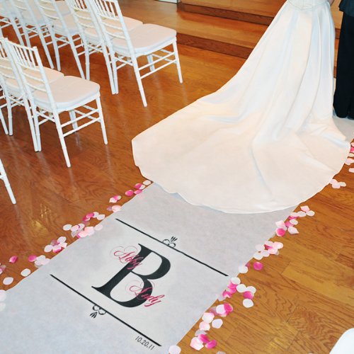 Give your ceremony a special touch with the Regal Personalized Aisle Runner. Create your own personalized wedding runner with your wedding date, names and initial printed in a color that matches your wedding theme. For color options see the Other Info tab. This wedding aisle runner features a crisp, white background. Comes complete with adhesive strip backing for placement. Built in easy pull cord for extension. Measures 36" W x 100' L. Made of non-woven rayon. Personalization is placed 8 feet down from the top of the runner. Non-woven Rayon. Assembly level/degree of difficulty: No Assembly Required. Made in America Read more...
