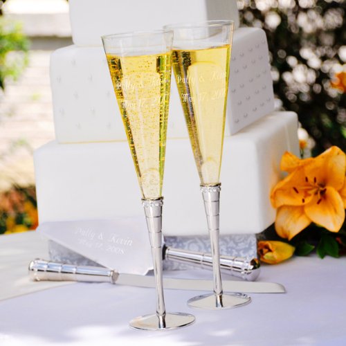 Feel like a true, regal princess on your big day with our majestic Royal Champagne Flutes & Cake Server Set. With its sleek shape, modernly etched design and crystals, this collection is sure to be the perfect finishing touch to your wedding day celebration! Noble set includes two toasting flutes and a cake knife and server. So, toast the town and your regal love with elegance!With free personalization, these toasting flutes and servers become an instant keepsake. Items may be sold separately, but save money when your purchase as a set.Details:Size: Flutes measure 11 inches tall. Knife measures 12 1/2 inches by 1 inch wide. Server measures 10 1/2 inches by 2 1/2 inches wide.Materials: Hand blown glass and zinc alloy on nickel-plated stem Engraving Options:The Royal Champagne Flutes & Cake Server Set may be engraved on the two flutes and cake server with two first names and wedding date (max of 24 characters per line) or two script custom lines (max of 24 characters per line) at No Additional Cost. Read more...