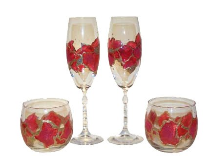 Stunning ruby anniversary set. This is a perfect gift for the lucky couple on their 40th anniversary. The set includes set of two Bohemia champagne glasses hand painted in gold and ruby red and two matching candle holders. Each piece has a hidden heart plus each is signed by the artisan. A truly special gift for a special couple. Candles not included. Read more...