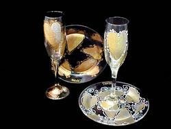 Delicately laced in white outlining, these shimmering hand painted hearts filled with gold and silver add beauty and elegance to a romantic mood. Imagine the delight of your guests when seated at a magnificent head table set with Bride s Heirloom and matching Grooms s Remembrance hand painted wedding flutes with one to be presented to each member of the Bridal party as a memento of this special day. Read more...