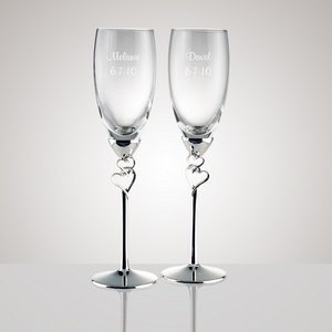 Toast to a happy future with these glass flutes with double-heart stems, a fitting and traditional take on personalized wedding gifts. These pretty glass flutes stand at 9.75" and can be customized with the couple's names and wedding date on the glass. Each personalized wedding gift has a unique fluted stem, with a pair of nickel-plated open hearts, a universal wedding design suitable for any bride and groom. These glass flutes are unique wedding gifts, and offer a different take on a classic wedding present.Personalization Information:Personalize this gift with the couples names and date. Read more...