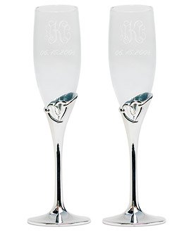 These classic flutes are stunning in their simplicity. Contrasting glass tops and silver plated stems create beautiful symmetry. The glass tops are fully engraveable, allowing you to personalize your own flutes or fashion gifts for others to be cherished for years. An elegant heart shaped flourish adds instant romance.10" H, 6oz.Please note the flutes are NOT frosted; they are a clear flute. Read more...