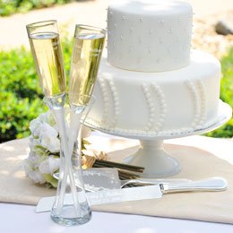 Celebrate the union of your new lives together with our unique Toasting Champagne Flutes in a Vase & Cake Server Set. With its unique design and unmistakable appearance, this toasting flute and server set make a statement without saying a word. The delicate flutes, which reside in a lovely tapered crystal vase, feature frosted stems and personalized engraving of the bride and groom's names and wedding date. This sentiment is also added to the intricately embossed, silver-plated serving set, and when the pieces are paired, they make an irrefutable display of vintage charm. After your wedding day, feel free to fill the elegant vase with ice, rose petals, crystals or other small items to coordinate with your home décor. Items may be sold separately, but save 10% when your purchase as a set. Details:Size: Vase measures 8 1/2 inches tall. Flutes measure 12 1/2 inches tall. Materials: Silver-plated setting and glass. *Please Note: Hand blown glass. Expect minor bubbles and swirls that are inherent to hand-blown glass. Substantial weight. Variations will occur on styles due to its hand-crafted nature. Engraving Options: The Toasting Champagne Flutes in a Vase & Cake Server Set may be engraved on the two flutes and cake knife with two first names and wedding date (max of 24 characters per line) or two script custom lines (max of 24 characters per line) at No Additional Cost. Read more...